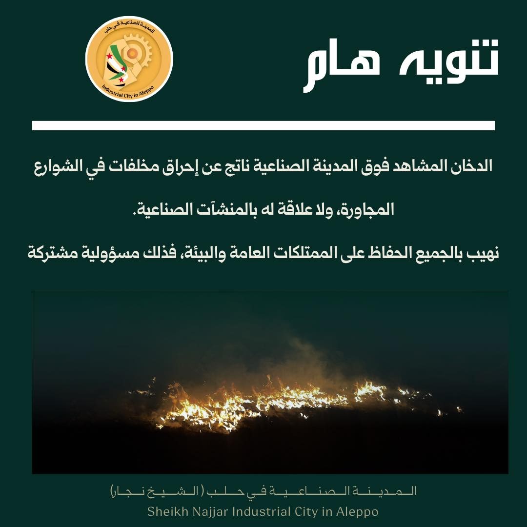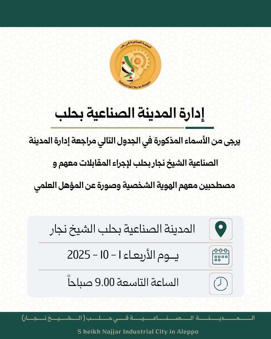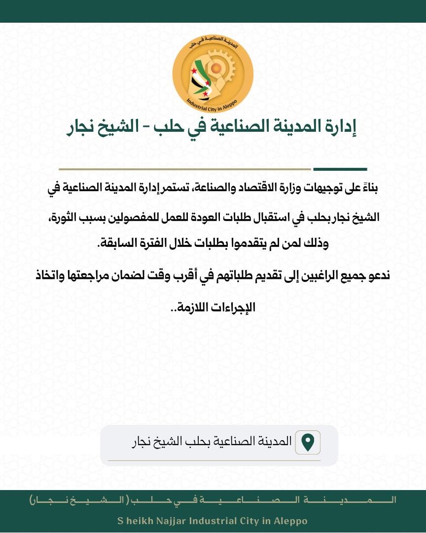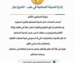 تتقدم إدارة المدينة الصناعية بحلب بالاعتذار من السادة المستث...
