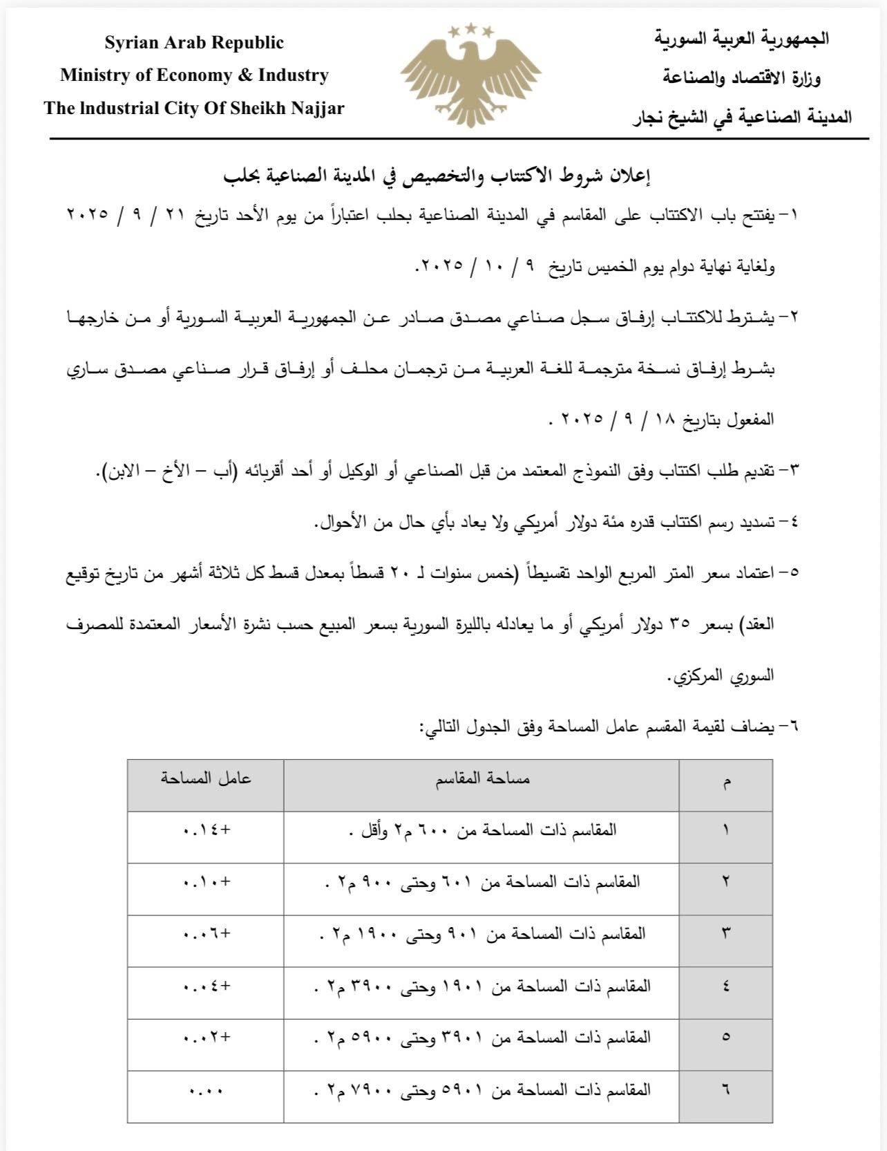 إعلان شروط الاكتتاب والتخصيص في المدينة الصناعية بحلب يفتتح...