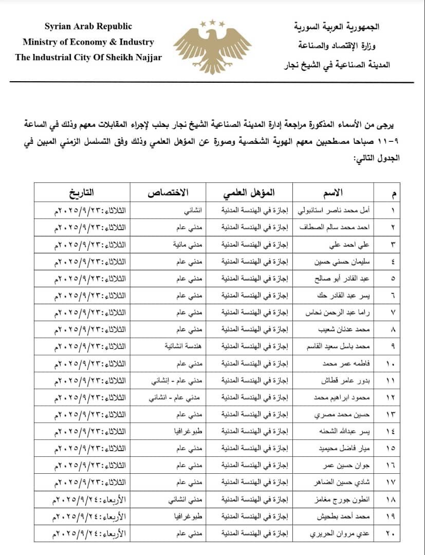 يرجى من الأسماء المذكورة مراجعة إدارة المدينة الصناعية الشيخ...