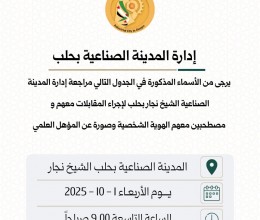 تعلن المدينة الصناعية بحلب عن تمديد المهلة المعطاة...