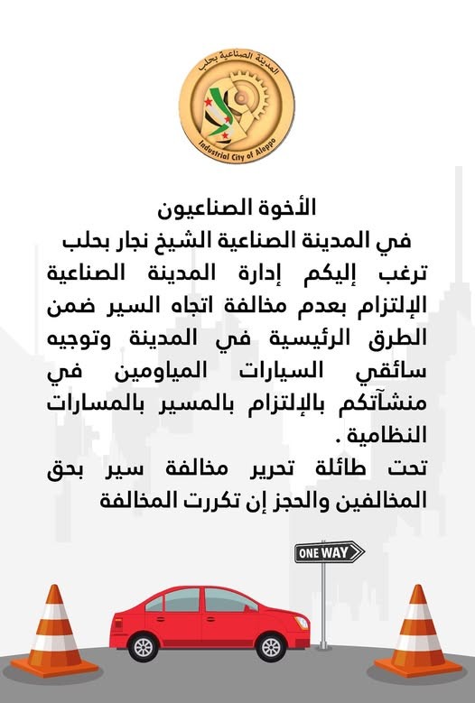 ترغب إليكم إدارة المدينة الصناعية الإلتزام بعدم مخالفة اتجاه السير ضمن الطرق الرئيسية في المدينة وتوجيه سائقي السيارات المياومين في منشآتكم بالإلتزام بالمسير بالمسارات النظامية .