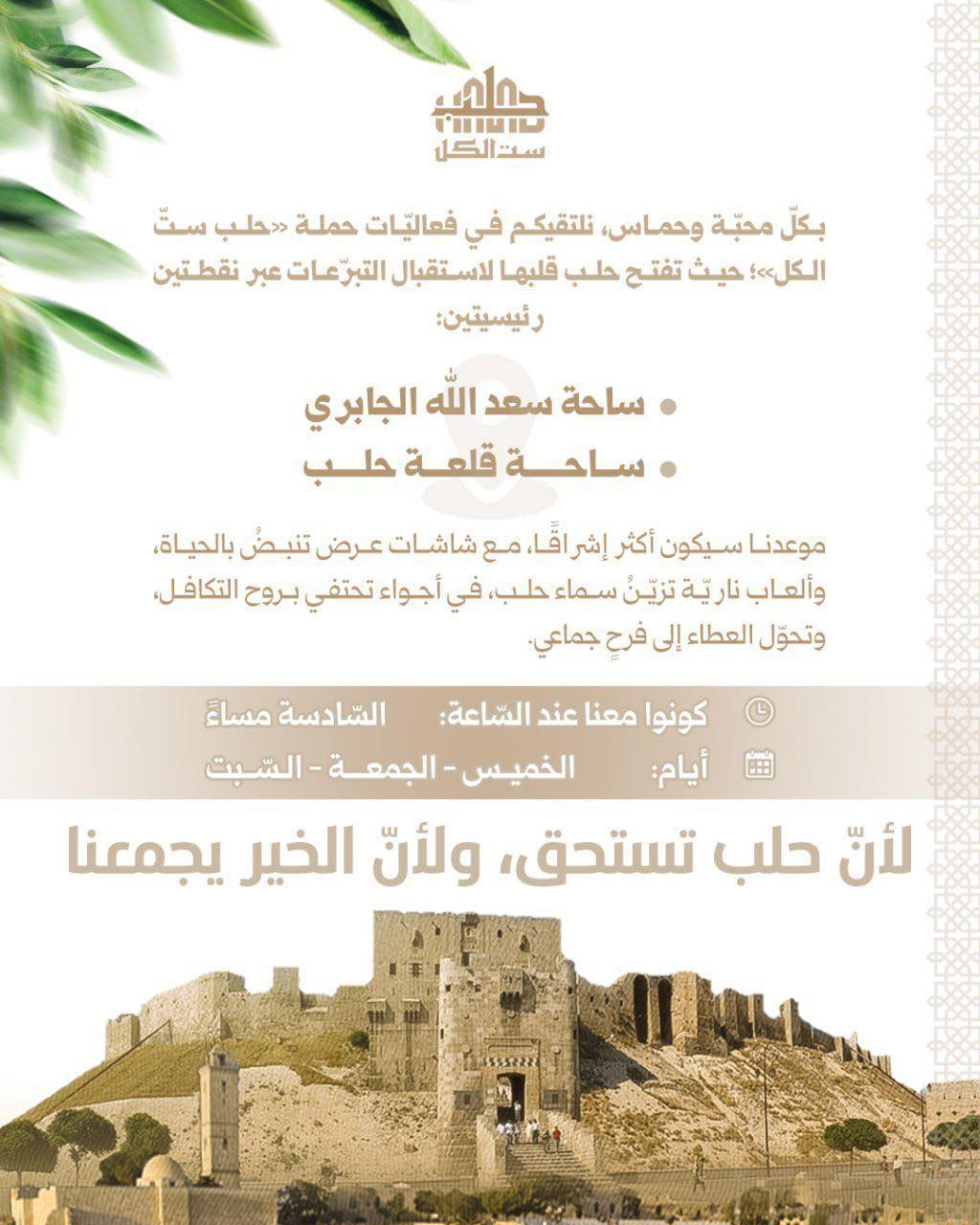 بكلّ محبّة وحماس، نلتقيكم في فعاليّات حملة «حلب ستّ الكل»؛ حيث تفتح حلب قلبها لاستقبال التبرّعات عبر نقطتين #ساحة_سعد_ا... المزيد