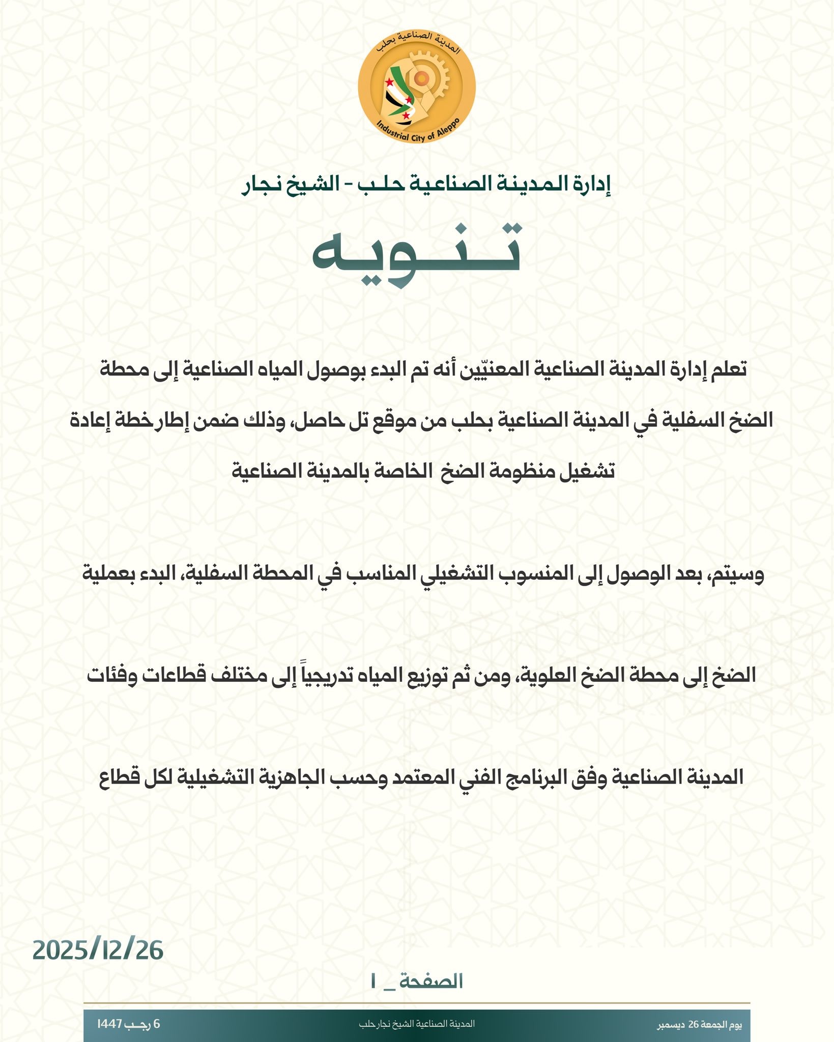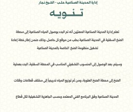 تعلم إدارة المدينة الصناعية المعنيّين أنه تم البدء بوصول المياه الصناعية إلى محطة الضخ السفلية في المدينة الصناعية بحلب... المزيد