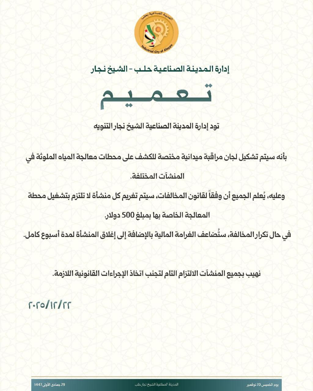 تُهيب إدارة المدينة الصناعية بحلب بالسادة أصحاب منشآت المصابغ ومكاحت الجينز ضرورة الالتزام التام بمعالجة مياه الصرف النا... المزيد