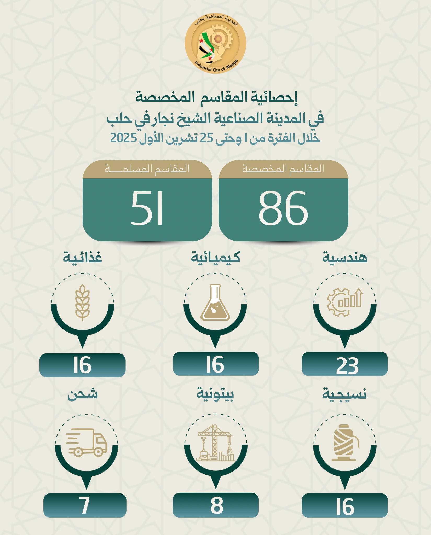 إحصائية المقاسم المخصصة في المدينة الصناعية الشيخ نجار - حلب...