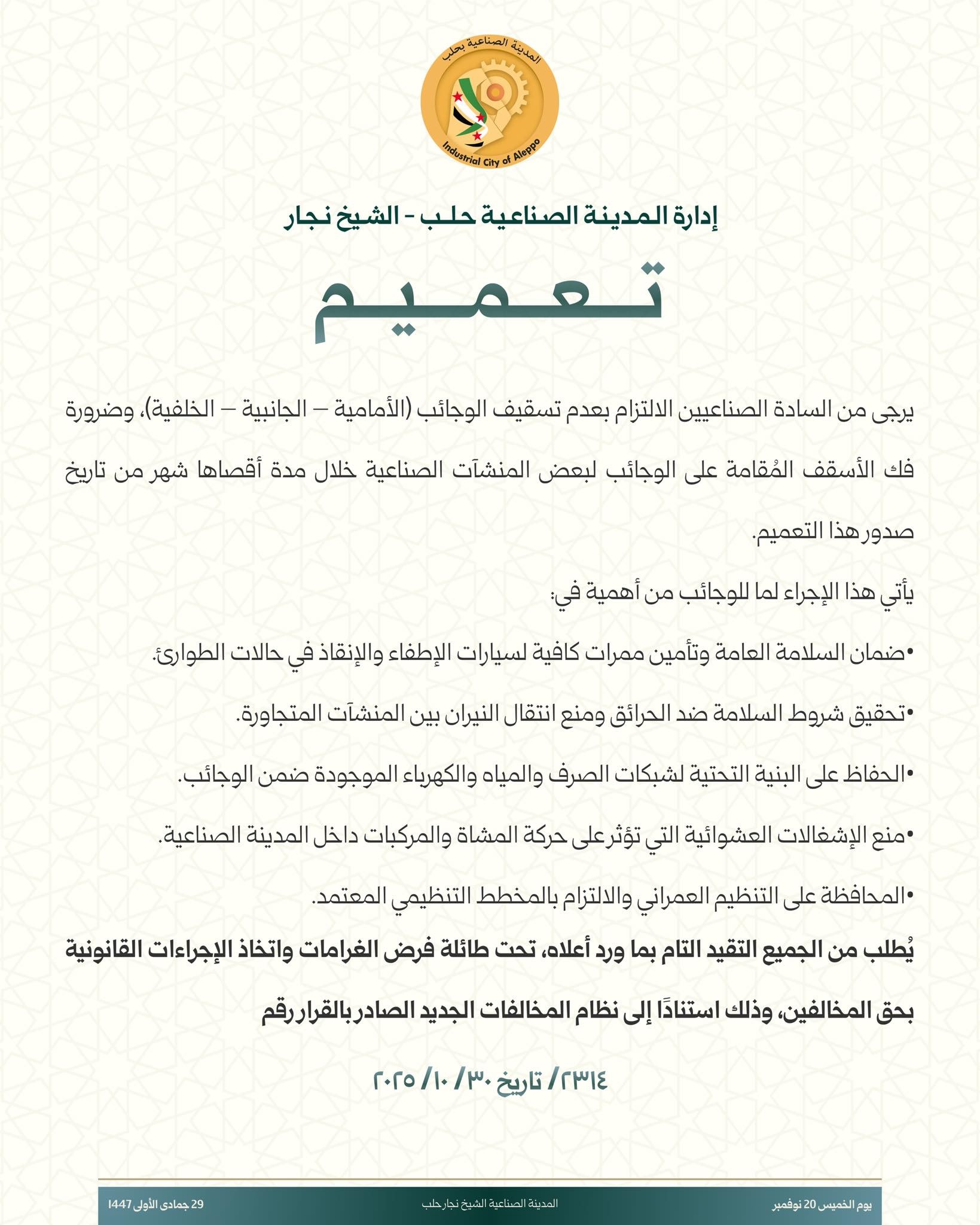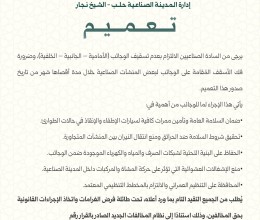 تعميم السادة الصناعيون في المدينة الصناعية بحلب، استناداً...